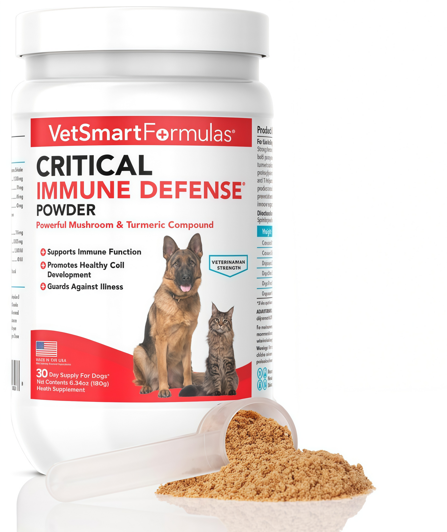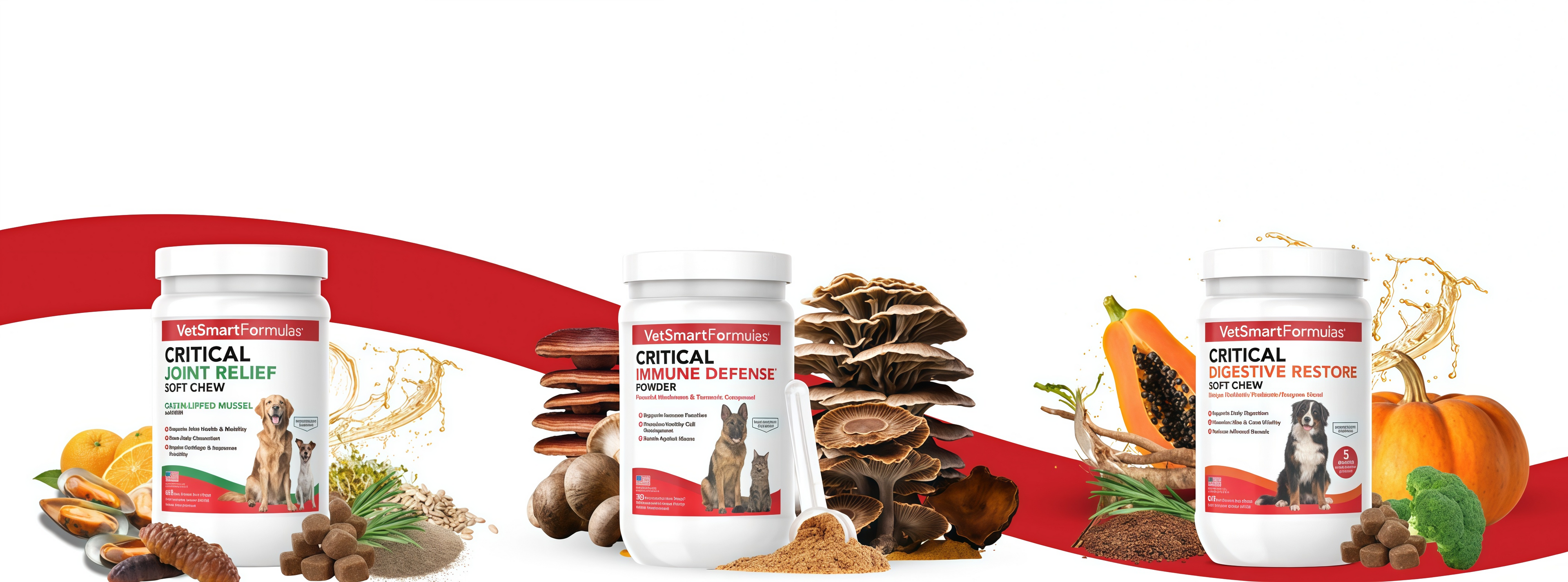 Meet the VetSmart Critical Line — our veterinarian-designed trio of powerful, all-natural supplements formulated to protect and restore your pet’s health from the inside out.Critical Immune Defensestrengthens immunity with a potent blend of mushrooms and white turmeric for disease-fighting power in both dogs and cats.Critical Joint Relieftargets pain and inflammation with clinically proven ingredients like Green-Lipped Mussel and MSM to restore mobility and comfort.Critical Digestive Restoredelivers 10 billion CFUs per dose with probiotics, prebiotics, and enzymes to balance your dog’s gut, improve digestion, and boost overall vitality.