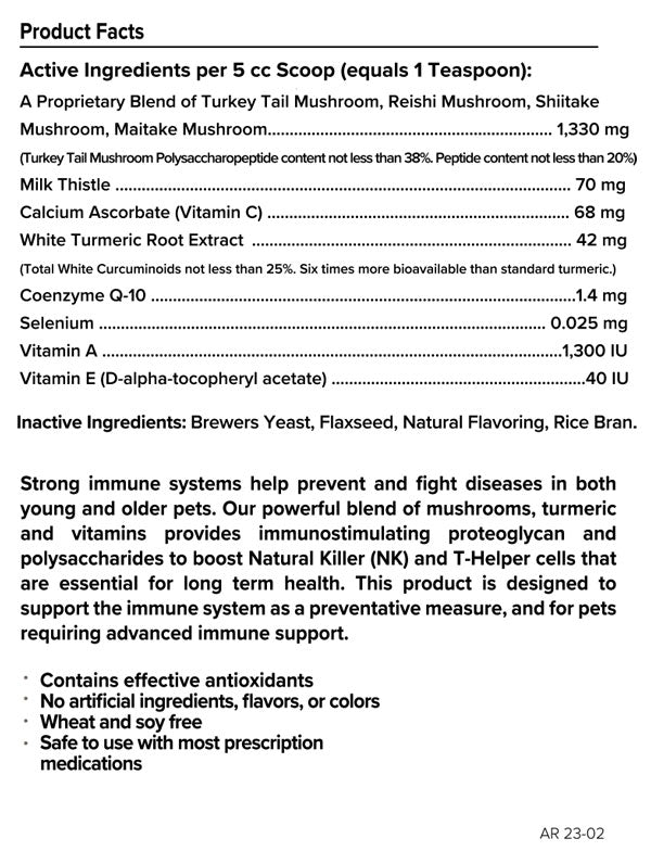 Most mushrooms are very beneficial to humans and both cats and dogs, and less than 1% of mushrooms are harmful. The mushrooms that we use in Critical Immune Defense are “medicinal mushrooms” and they have been used to boost immune systems for centuries and are proven to be safe and effective for cats and dogs. For more than 30 years medicinal mushrooms have been approved as cancer treatments in Japan and China. More recently, the U.S. Food and Drug Administration (FDA) has approved clinical trials for Turkey Tail and other medicinal mushrooms.