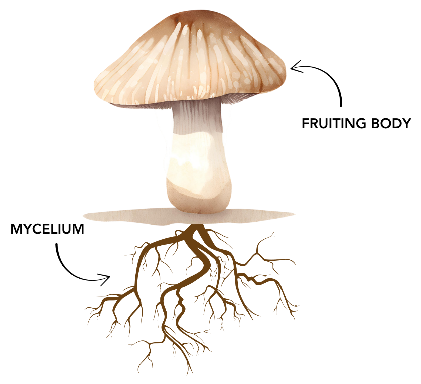 Fruiting Body: This is the part of the mushroom you're familiar with—the cap and stem.